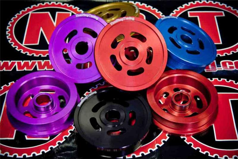 ![]() ![]() ![]() ON THE TOPIC OF VIBRATIONS, HARMONICS, AND SAFETY This one deserves an entire book, but here goes... QUESTION: Will NST Pulleys lead to premature engine failure? I cover this topic several times a month but I don't mind, I understand that your cars are a very large investment for all of you and I prefer that you be intelligent and informed about all your modifications. So here we go again... Please take a few minutes to read everything I have posted here, as I worked hard on trying to give you a good explanation on the topic... In the past many engines were externally balanced. There was an external balancer attached to the outside of the engine, on the crank snout, used to balance the engine externally. The crank pulley in such engines would then be attached to this balancer. Removal of this balancer is a bad idea. These balancers were most often used on large V shaped engines of the domestic muscle car era. Take a look at any modern (1980s and beyond) Honda, Toyota, Nissan, or other Japanese engine and you will find no such balancer. These engines are all internally balanced, and this process has improved even further since the late 1990s. So the topic of a BALANCER does not apply here. What you will find on many modern engines is a harmonic damper. This is a small rubber band, litterally less than 2mm, less than 1/8th of an inch, thick that is built into the crank pulley. OEM crank pulleys are often called DAMPERS. Try placing an order for a crank pulley at your dealer and your invoice will read damper. This rubber is used to absorb something called NVH, noise/vibration/harshness. In addition, the rubber is in part designed to help the inherent balancing flaws in a cast iron pulley. Suffice it to say, this rubber is actually not very good at performing its intended purpose after as little as a few thousand miles. What happens to rubber after a couple years of humidity, weather, snow, rain, etc? It often becomes brittle, hard, and crunchy. Can something with these properties actually absorb vibrations very well? What happens when the cast iron pulley begins to crack and chip with age? Will the balance of this pulley get better or worse with age? NST Pulleys are CNC machined T6 aluminum pieces and are anodized for extra strength and durability. These CNC pieces are zero balanced from day one, do not have the inherent flaws of cast iron pieces, and do not require extra damping properties of rubber. NST customers have consistently reported smoother running engines with NST pulleys vs OEM, especially at idle. How is this possible if the rubber in the OEM pulley is such a vital and super important piece? Perhaps the rubber is not as important as it is cracked up to be? On a relatively near stock motor with bolt-on mods or low amounts of boost like what most of the people on this forum probably run, a solid pulley will not have any life threatening consequences. The engineering reasons are that most modern engines have a short, strong crank with, a relatively high natural frequency. The dangerous second harmonic that can cause damage occurs at an rpm that this sort of engine will never see, in the area above 10,000 rpm. Even the stock damper is not tuned for attenuation at this sort of rpm so the argument is somewhat of a moot point. Now weak engines that are pushing the limit with LOTS of revs, wimpy cranks, super long strokes, lots of boost and dwelling in the upper rpm ranges for long periods of time can benefit from a damper designed to deal with this sort of operation but our engine is not like this, and probably very few people with this motor on this forum push the envelope that hard. How many 500HP, 12,000RPM motors do we have on these forums? As far as I can tell, our engine has a strong and stiff bottom end that is well built for our intended use. It has an internally balanced crankshaft which is less like to break due to torsional vibration. There are a lot of Honda, Toyota, and Nissan guys who use underdrive crank pulleys in road racing series like NASA or SCCA. Road racing is much more punishing on an engine than other motorsports. The engine is subjected to run times lasting roughly 30 minutes with the engine always in the upper ranges of its rpm limit. One race weekend is the equivlent of hundreds of 1/4 mile passes. These guys would not use NST pulleys if they were not reliable. NST sponsored the first ever wheel to wheel Scion tC NASA Road Race car. The same car was very competitive in the Grand Am series and had factory backing from Toyota, Scion, and TRD. This car used pulleys from NST with great results since day one. NST has sponsored several drift cars participating in the professional US drift series, Fromula Drift. Several of our cars have also competed in the Xtreme Drift Circuit and NOPI Drift series. To make things better, NST products are also used in autocross, time attack, and drag cars. These cars have been using NST pulleys with no issues of any kind for the past few seasons. We could go on and on... Is a solid crank pulley harmless to all engines? No it is not. As I said... small, super high reving engines, when modified way past the simple bolt on stages may have problems. These engines reach critical harmonics, past the 10,000 rpm range, an RPM only reached by certain RACE engines. A mildly modded engine (intake, header, exhaust, etc) be fine but one subjected to high rpm for long periods of time (90% of its life) with LOTS of boost will probably suffer. In this case, the stock damper is not adequate either. Some of the older american V8 engines are externally balanced and it is critical not to use a solid hub pulley not designed for these applications, or damage to the engine could result. You will not find solid NST pulleys on our website for such engines. Our engines and most around here do not fall into the above categories. Rest assured that your engines will not blow up and die nor have a reduced life in street and even racing use wi