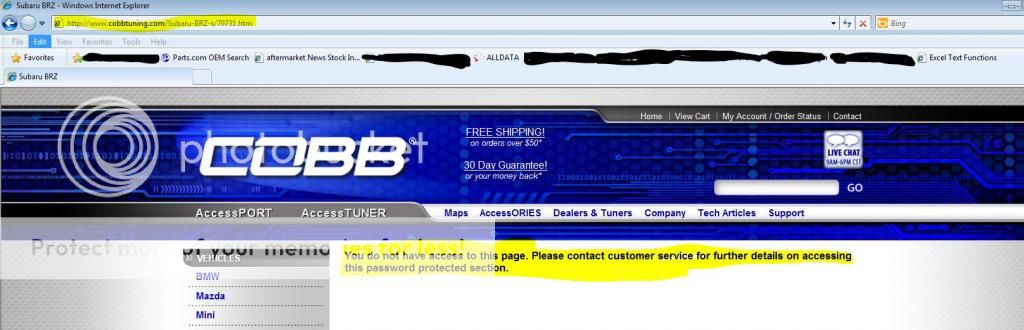 ![]() It seems they've set up a BRZ subsite that isn't public yet since it is password protected. Can anyone with knowledge of Cobb's inner workings confirm or deny that this is being set up for an upcoming product release? If so... ![]() Just a note: I work in the aftermarket for a parts manufacturer and had to black out some Favorite sites since they pertained to work and I most certainly will get beheaded if I "misrepresent the company" online.