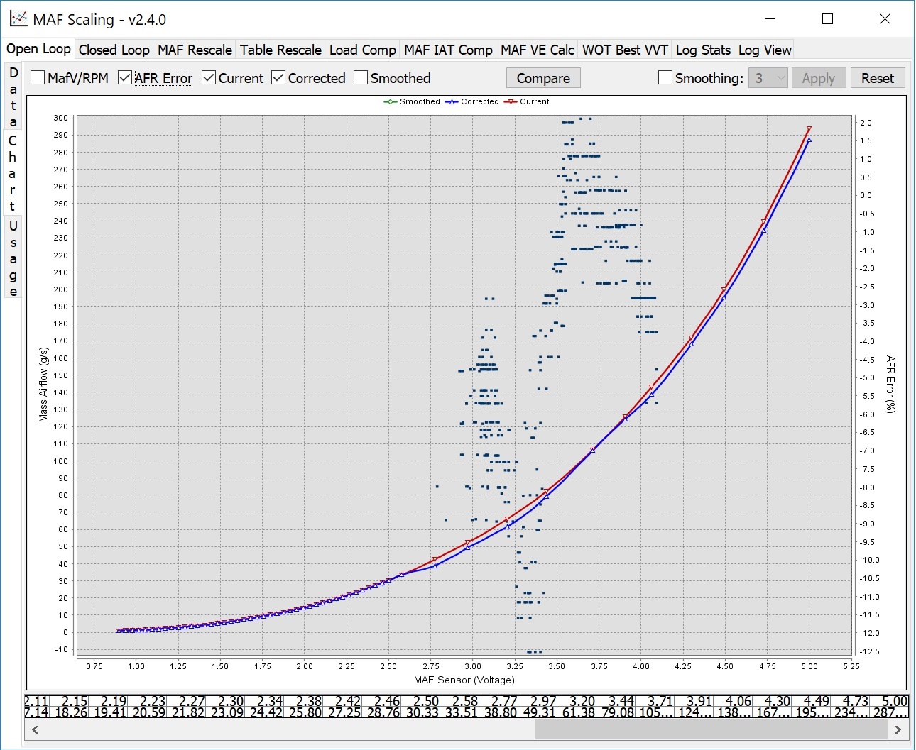 http://datazap.me/u/spuds/olsample2?....29&tmax=44.65 Mods: OFT Stage1 93 octane, Perrin inlet tube, nothing else worth noting. In case its not obvious, Im referring to the sawtooth-like pattern in my actual AFR. Drops gradually, then resets around 4200 RPM, then starts dropping again. Im going nuts trying to figure out what is going on. ![]() Has anyone seen this before? I imagine this isn't limited to my car, but its kind of hard to search for what someone else would call it. If the answers are on the forum somewhere, please send me in the right direction. Are there any troubleshooting suggestions? I was thinking of logging .75% throttle pulls and seeing if the same thing happens as my next step, but not really sure what that would tell me. Lastly, since Im pretty sure this will be the first suggestion, I could correct with MAF scaling, but take a look at what that would look like. My closed loop is exactly what is needs to be, so that part isn't changing. With that shape making no sense, it seems like there should be something else I can do to compensate. Last edited by Spuds; 06-17-2017 at 11:29 PM. |
