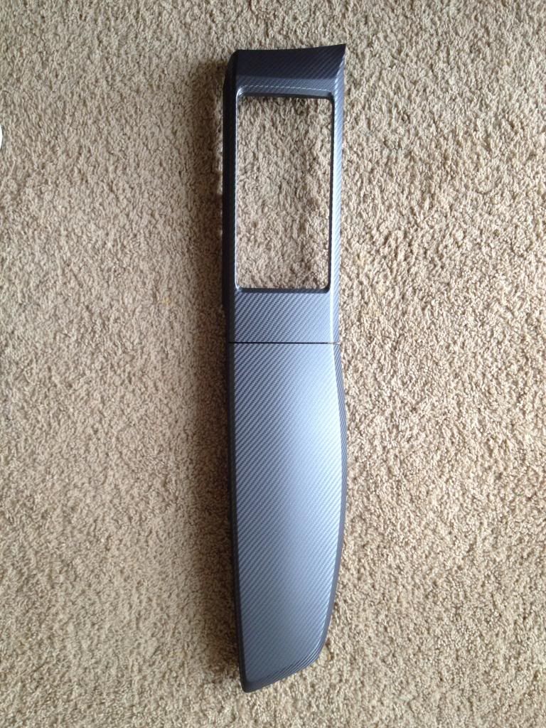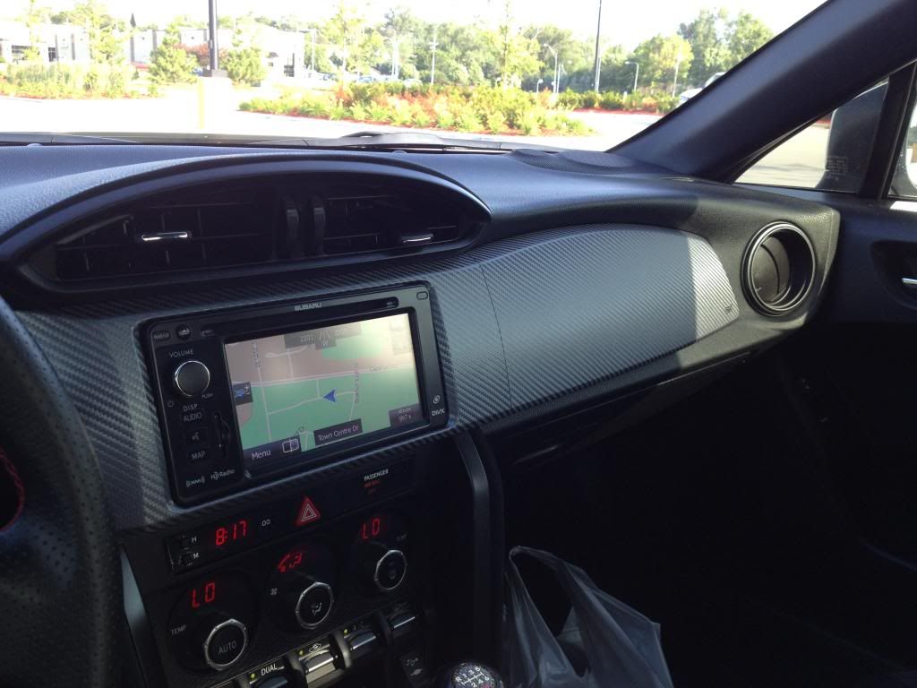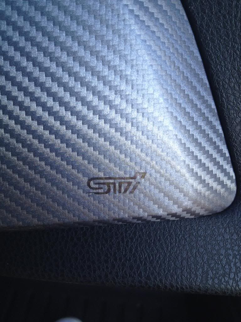 This is the type of 3M ordered [ame="http://www.amazon.com/3M-Scotchprint-Carbon-Fiber-Anthracite/dp/B00597WDN6"]Amazon.com: 3M Scotchprint 1080 Carbon Fiber Vinyl Flex Wrap Anthracite CF201 60"x12": Automotive[/ame] Take your dash pieces out and grab your heat gun. Go to town and it will look like this. ![]() ![]() ![]() ![]() I added a little touch of my own with a small subtle STi decal in the bottom right.