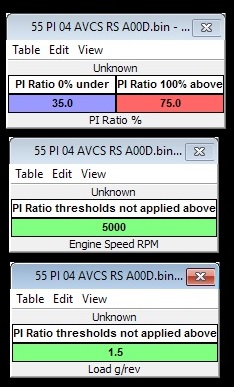 I still have the stock PI ratio thresholds. I'm trying several other PI/DI tables as well as this one, which I will test at low rpms with high loads. I may need to rescale the tables for higher load conditions, so it will have some PI all the way to 4.0 load. On the other PI/DI thread there is quite a lot of information by experienced tuners, but nothing recommending more PI under boost conditions. Since boost is usually above 3000 rpms, I'm trying to limit my PI to about 2400 rpms. The thresholds means that it will get 0% PI from 1.2 - 1.5 load, but from 1.5 on up to 4.0 load it will get 20% PI. I'm not sure how well it will run at 1.3 and 1.4 load without any PI, that's why I might need to rescale the table.