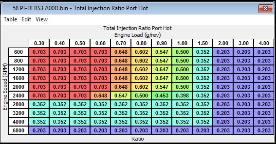 where he says " We've seen some tuners swear by DI only, and others use 50/50 split or even full on PI in really high HP applications. I don't think either one is a good solution. Think of it this way: DI fuel delivery will always be the optimal method, UNTIL you make the mixture too unstable or wash the cylinders. Wash is unlikely, but once you approach 7ms injection times (250+whp with e85) you begin to lose some of that benefit. The mixture becomes less stable. Between about 300whp you cross over the threshold where 35% PI has no negative effect. 20% PI on OEM tunes? We have found absolutely no repeatable HP gains, as in 0, like none-what-so-ever. Despite changes in timing, leaner or richer, more or less aggressive cam timing, or different injection timings...I think one car actually made 1hp over 20% PI mix...which is within the margin of error between runs. So in reality, there's just no reason to overstress the DI system with long IPWs. Take advantage of the dual injection, max out the DI to about 6 ms (this way in sub freezing temperatures you have headroom) and then run port at no more than 80% duty cycle, or about 15ms." I'm trying to create the best table WITHOUT modifying the PI ratio thresholds, because I haven't got the code to make that change for any other CAL ID besides my own. That means I have to stay >=35% PI below 5000 rpms and 1.5 engine load. I made a table where PI should always be on, and I re-scaled it to go to 4.0 Engine Load, see below. I tried it and found the acceleration above 1.0 load to be really good. I'm going to try reducing the PI percentage in the areas below 2800 rpms, and below 1.0 load to get the best power and drive-ability. This has proven that 20% PI at heavy loads performs well, the only questions are; where do I want to exceed 20% for better torque at low rpms, and how much at what loads.