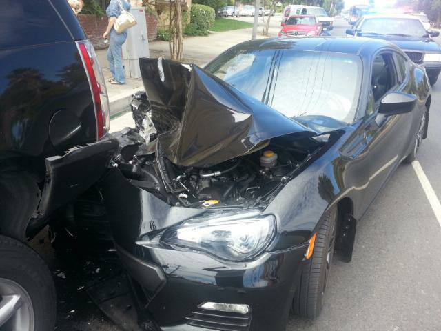 Why didn't the front car get much damage? The impact got mostly absorbed by the BRZ. May not be a bad thing.