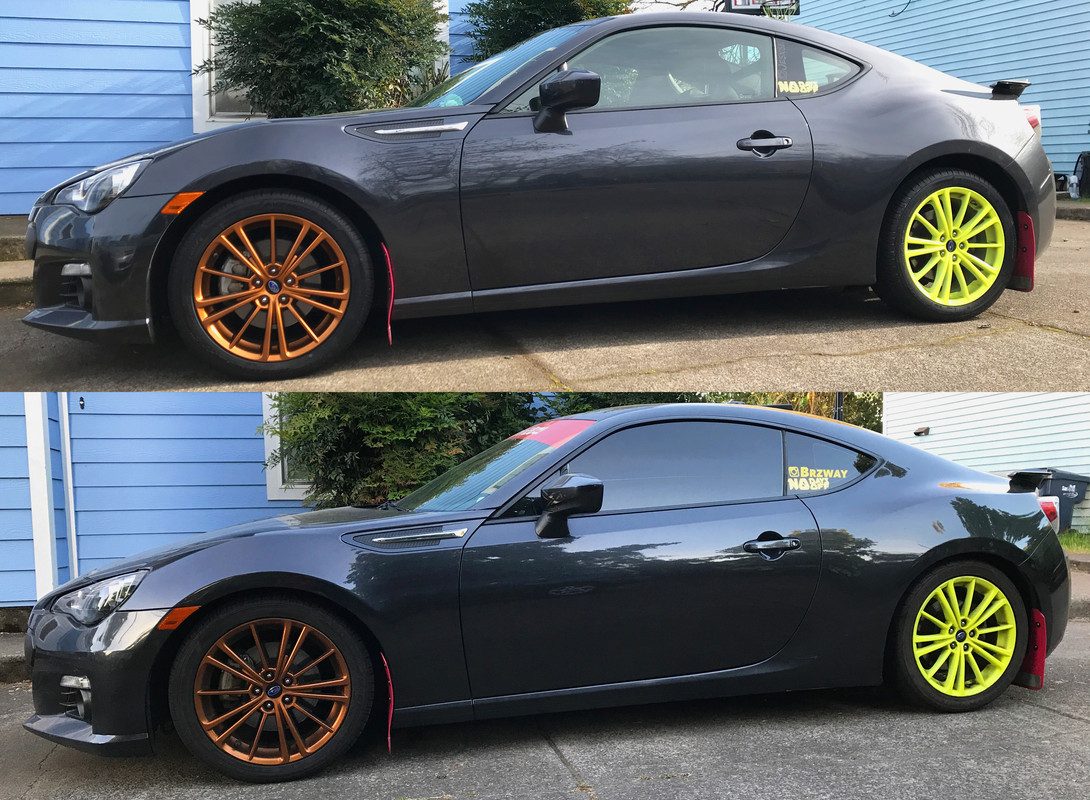 The before picture was taken a couple months before. I just happened to have that photo. Spring Specs From CSG: Swift Spring - Spec-R Springs Application: Subaru BRZ / Scion FRS Spring Rate (Front): 4.4-kg/mm (245-lb/in) Drop (Front): -28 mm (-1.1 in) Spring Rate (Rear): 5.3-kg/mm (296-lb/in) Drop (Rear): -25 mm (-1.0 in)