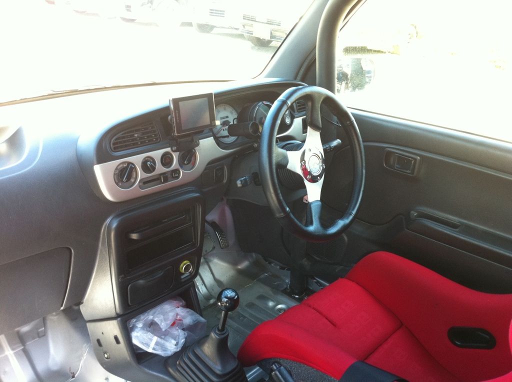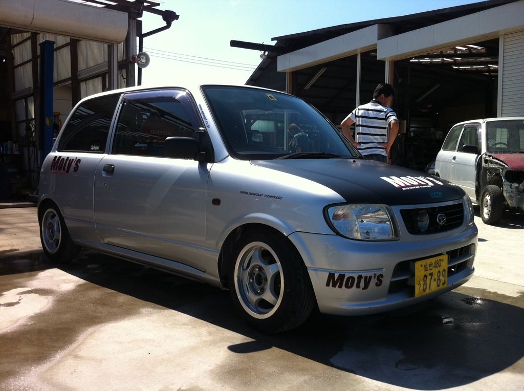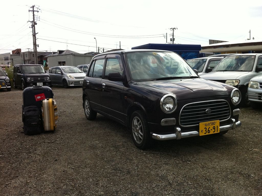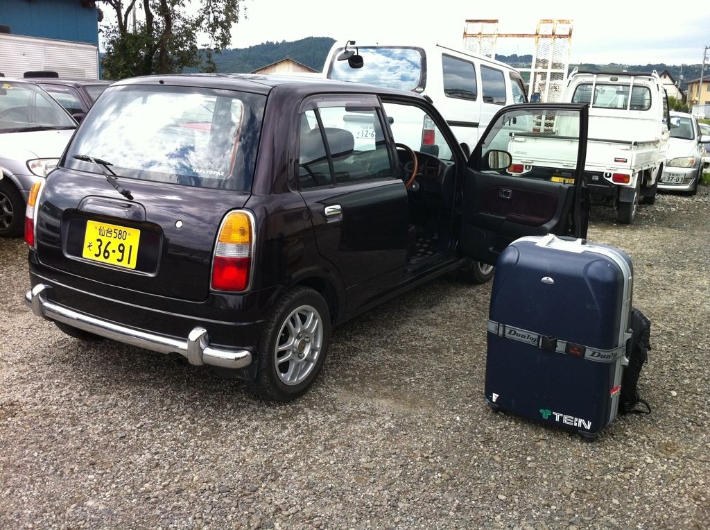 A Daihatsu Mira Gino. Didn't think it was worth mentioning. It's a kei car which means it can't even pass kids riding tricycles, but my friend lets me borrow his shop loaner cars for free, so I can't complain. Here's a picture of it...along with my luggage. :P ![]()