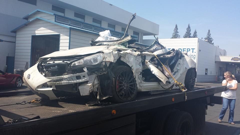 Accident happened about a week ago, don't know the location but I presume here in Northern California. Don't know the condition of the survivors or who they are. Basically this car was being transported from one yard to another. Apparently the car rolled several times (obviously) but amazingly rolled OVER a 6 foot fence WITHOUT actually touching it! That means it was seriously airborne...!!! |