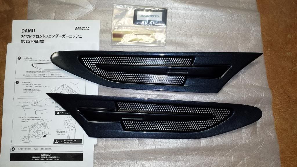 Selling my DAMD Front Fender Garnish (Vent). Pretty much same thing as the Prova version but emblems say DAMD instead. First in the USA if I'm not mistaken. Color is 61K (Dark Grey Metallic/Asphalt). I rattle can painted the metal accent mesh matte black. Test fitted passenger side but decided to go a different route. First pic is of the actual vents. Second pic is the DAMD promo pic.