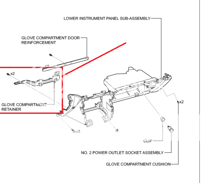The "glove compartment retainer" has a screw with a head facing the engine. In order to access it, you need to get under the dash. Unfortunately, you have about 4.5" of room to maneuver a screwdriver in there, and the screw is too tight to get off with so little room. No biggy, right angle screw driver! Not so fast...they decided to recess the screw about 3" into the plastic, so none of my right angle screw drivers are even close to being long enough.