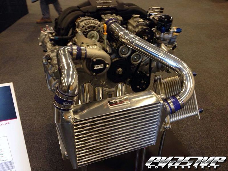 Its the new layout for the HKS supercharger system which base from our car Pikes Peak car and HKS japan D1 car. With 2.5 inch piping and less parts it should keep the price a little lower then the old kit. The HKS kit like our Pikes Peak car can make up to 300-400whp. You would need to build your motor, fuel system, and smaller pulley. Which HKS plans on releasing a stroker kit too at the same time. Kit should also come with HKS new flash editor ECU.