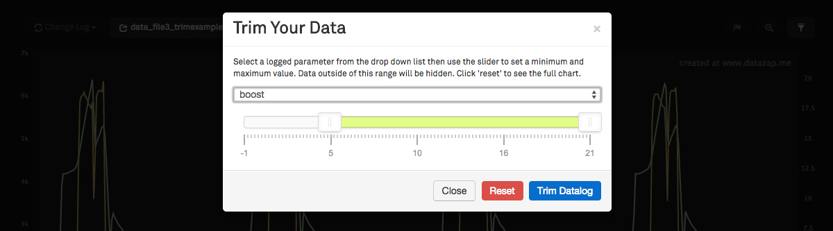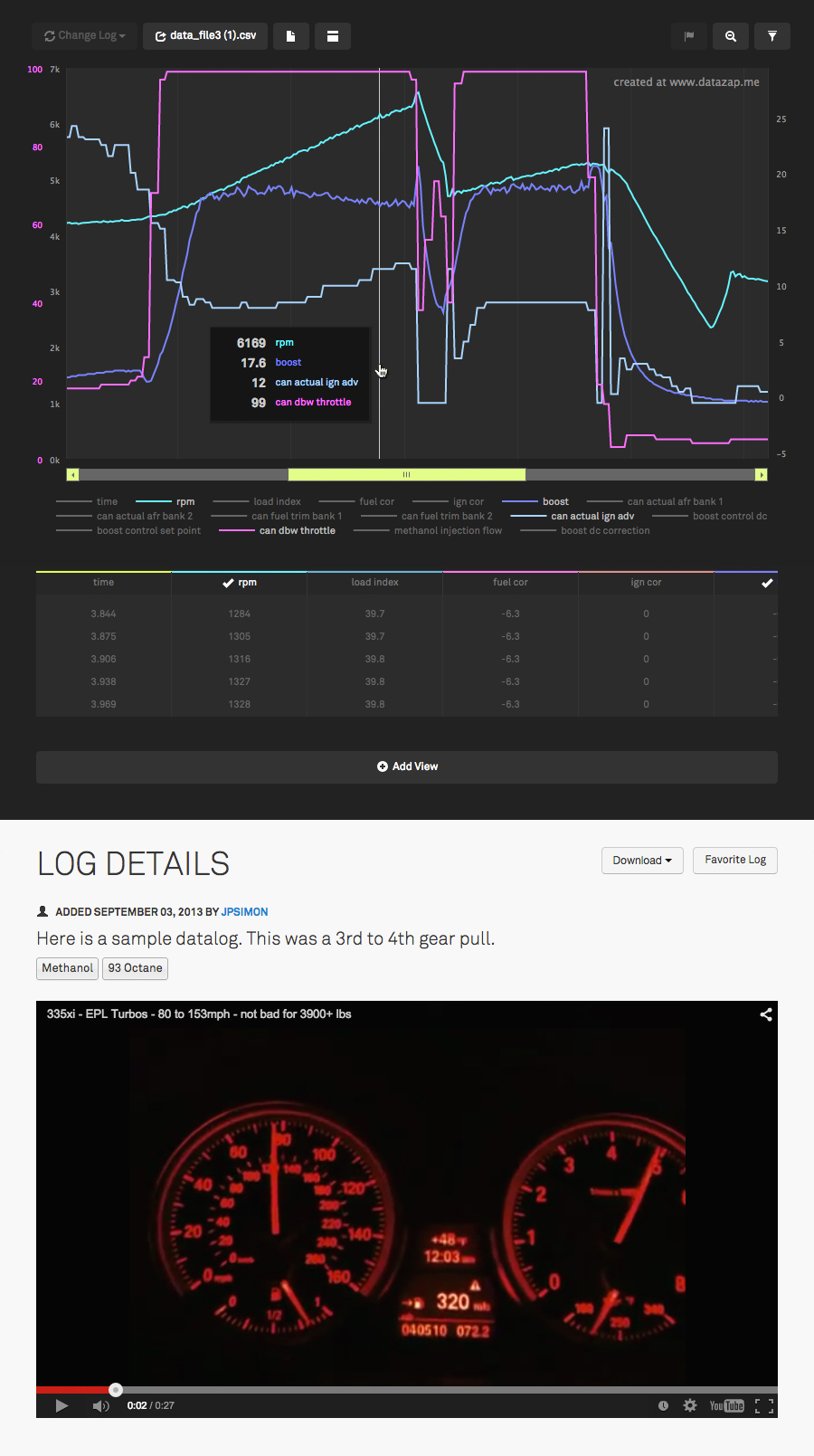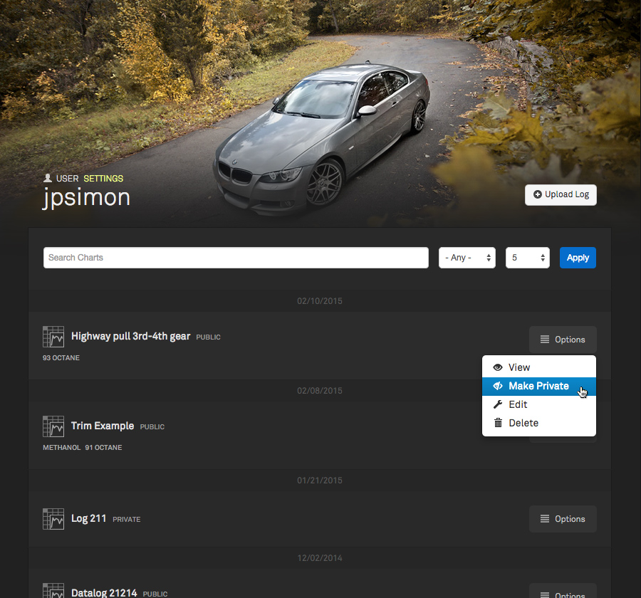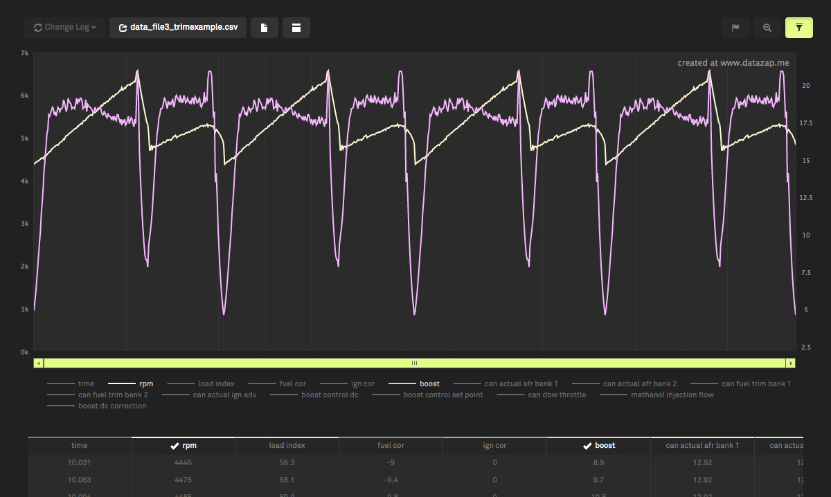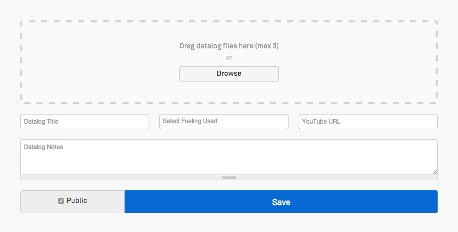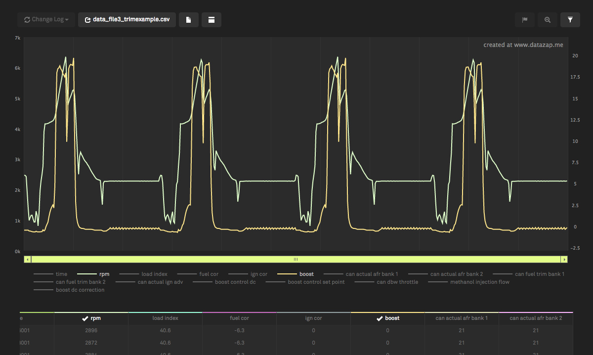 Before I get any further you'll notice I do not support XLS/XLSX files any more. 99.9% of people have CSV files to begin with, so for those who actually do have BavTec XLS logs, just convert it to a CSV and then upload it (I put a link on the FAQ page for a free/fast online tool that will convert XLS/XLSX files to CSV for you). On to the changes... Log Upload / Chart Creation / Increased file size - There are now 2 separate CSV upload forms. One for standard english CSV files that use a period for the decimal-mark, and the other is for international logs that use a comma for the decimal-mark. Additional processing is required on the non-english logs (and on some other random log types that use weird line breaks or separators). For the vast majority of users who have the standard english period decimal mark, I've increased the upload size to 5MB per log. - Drag & drop upload. You can now drag your logs directly onto the drop-zone (or you can click browse). - Giving your log a title is now not required. The system will give your log a generic name if you don't fill in the title field. The only thing required to create a page is the log file(s). - You can now add a youtube video to your log page. I thought that would be a useful thing to include to help give people more context when looking at the log (i.e.... dyno pull, 1/4 mile run, or trying to demonstrate an issue that the log is representing). This is what the new form looks like. It's way more clean: ![]() Here's what a log page looks like when you have a youtube video added: ![]() Chart Interaction - Trimming/Filtering Data - A lot of people have requested this one... You now have the ability to trim your log based on a user adjustable min/max of any logged value. It's super easy (obviously non-desutrctive, you can always revert it). Here's how it works: Say you have a long log with a bunch of pulls that are spread out like this: ![]() Click the trim button in the upper right and choose a parameter you want to filter by. ![]() Use the slider to set the minimum and maximum value - everything outside of that will be hidden, the chart will be condensed and everything will be easier to view. Here's the same chart after setting the minimum value of boost to 5.. it hides everything in between the pulls: ![]() Profile Page changes - Here's what the updated profile page looks like. I've added the ability toggle the privacy of a log directly from here so you can quickly make things private or public: ![]() hope you guys like the changes! I have some other cool things planned so stay tuned!