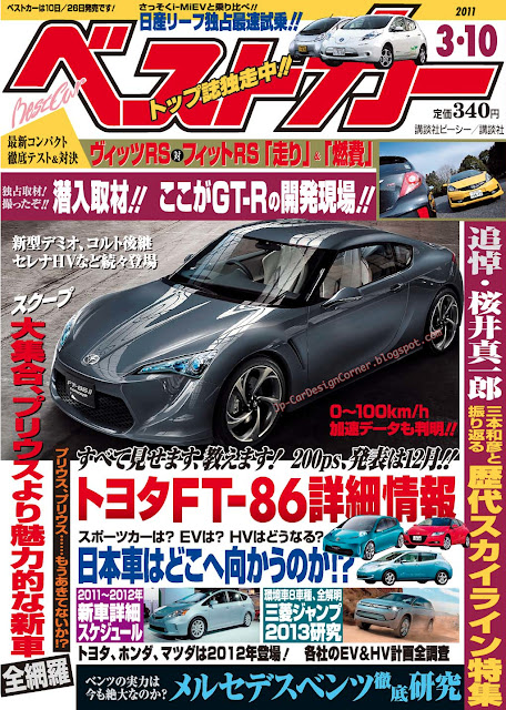 The low weight should enable the FT-86 to be among the "greenest" cars in its class (earlier post), and the estimated fuel efficiency is 17.5 km/L (10.15 mode). The overall dimensions of the FT-86 (L x W x H) are 4,160 x 1,760 x 1,260 (mm Read more: Japanese Car Design Corner / 日本自動車設計角: FT-86 variants FT-86のバリエーション http://jp-cardesigncorner.blogspot.c...#ixzz1DFLxdUZG If you appreciate my work, then please use a reference for the content you copied Under Creative Commons License: Attribution Non-Commercial ![]() ![]()