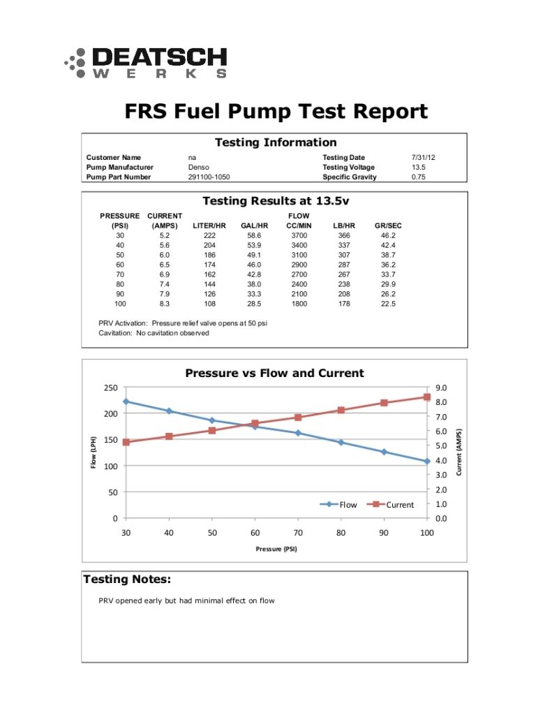 To look at the future possibilities of the FRS engine, we first need to understand where it starts. Below is a walkthrough detailing some of the OE fuel system components on the FRS. PART 1: PORT FUEL INJECTORS Scion PN: SU-003-003-26 Manufacturer: Denso OE PN: 2040 Testing Data: ![]() Flow Data Summary: Static Flow: 205cc/min at 43.5psi (3bar) Spray Pattern: dual beam split V (~10*) Dynamic Flow: see reports for detailed flow data Injector Description: The Denso injector used in the FRS is different from a lot of other injectors. The injector utilizes a 11mm upper o-ring, sumitomo electrical connector, and a high impedance 12.3ohm coil, which is all fairly common. However, the injector body is very short (40mm functional length) and the nozzle is extended 20mm. This yields an overall overall length of 68mm. Pictures: FRS injector (side view) ![]() FRS injector nozzle (bottom view) ![]() FRS injector connector (top view) ![]() PART 2: FUEL PUMP MODULE Scion PN: SU-003-01-018 Manufacturer: Denso OE PN: 291100-0090 Testing Data: Module Description: The module (aka bucket, aka assembly) is fairly standard in size, shape, and design. The FRS fuel system appears to be returnless because there is only one outlet on the module (see pics). There is an internal regulator that keeps the system pressure a constant 4 bar (58psi), which also indicates a returnless system. I am not aware of another manifold referenced regulator anywhere else in the system. There is also a post fuel pump filter integrated into the module. Both the pump and internal regulator are held into place with a special pre-filter (aka sock) that has integrated clips. Fuel pump modules often have an effect on flow rates. Therefore the OE pump was flow tested both installed into the module and outside of the module. See the report for detailed flow results. Pictures: FRS module assembled (side view) ![]() FRS module assembled (top view) ![]() FRS module - opened ![]() PART 3: FUEL PUMP Scion PN: NA only sold with module Manufacturer: Denso OE PN: 291100-1050 Testing Data: ![]() Pump Description: The first obvious thing to note is that the fuel pump is very small. The overall length is 96mm and the diameter is 38mm. Other than the size, the pump is pretty normal. It features a single stage, single row turbine impeller, internal check valve to hold system pressure and a spring and disc style PRV (pressure release valve). The connector is not a standard style. When tested, the pump operated very quietly and smoothly drawing very little current, but also flowing quite modestly. The PRV begins to opens at 50psi which is interesting given that the internal regulator is set for 58psi. The PRV does not bleed off a lot of fuel so effects on flow are pretty minimal. Pictures: FRS pump (side view) ![]() FRS pump inlet ![]() FRS pump outlet