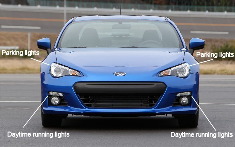 The wraparound "eyebrow" lights are the BRZ's parking lights. There are no other DRL lights other than the lights right above the foglights. I'll post a picture with highlighted lights marked with lines just to be totally clear. Anyone who's been reading this conversation knows where these lines are pointed, to anyone who doesn't I specifically highlighted the wraparound parking lights in the headlight lenses.