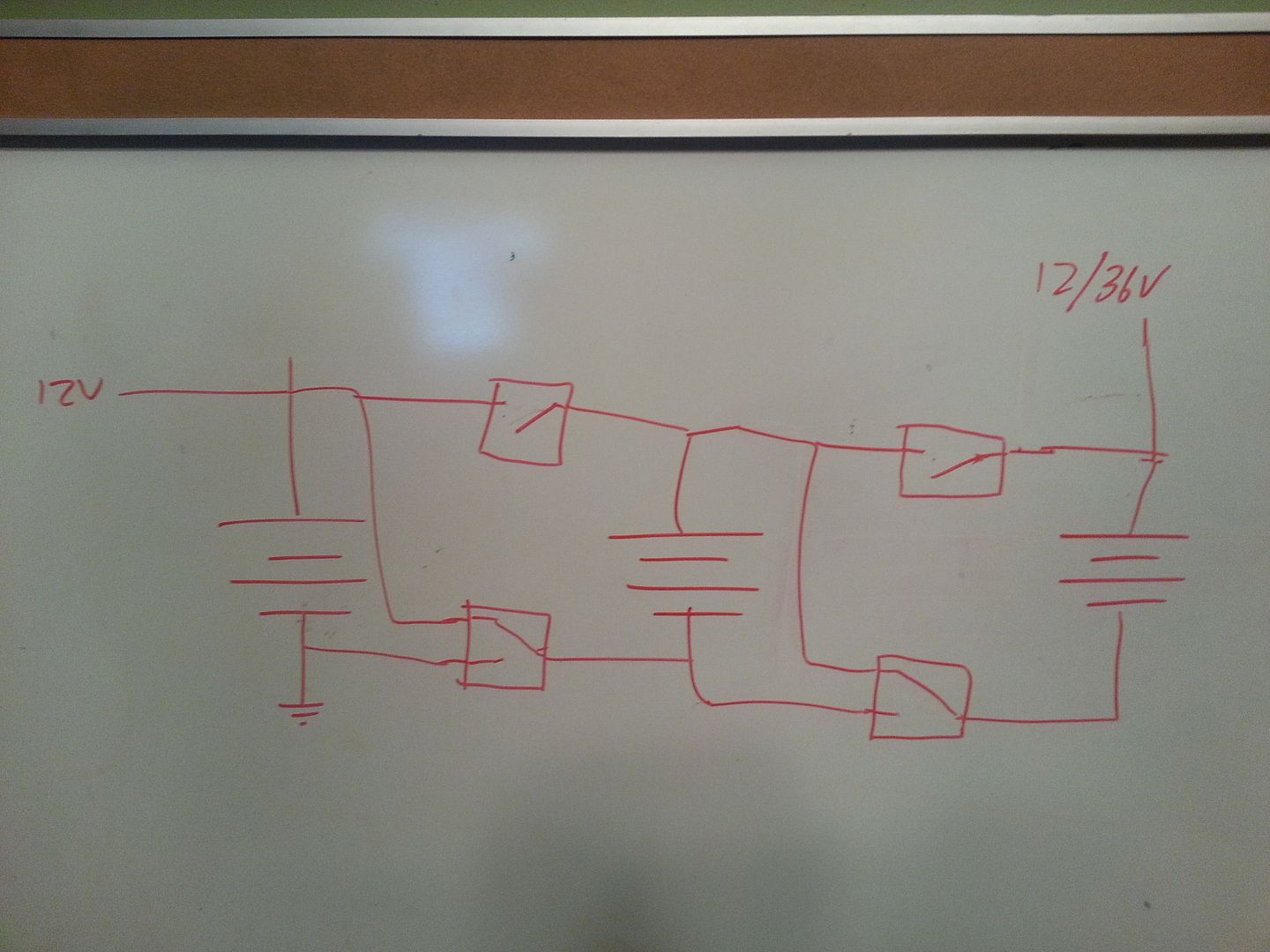 It needs one more relay. Lose the connection to 12V on the left. The last relay has the 12/36 as the (I'm blanking on the technical name) common contact that actually moves, the other two are the alternator and the electrocharger so it is either charging or driving the EC. A system like this should have all its batteries isolated from the battery the car runs off. If you want 36 volts, you should have four batteries.