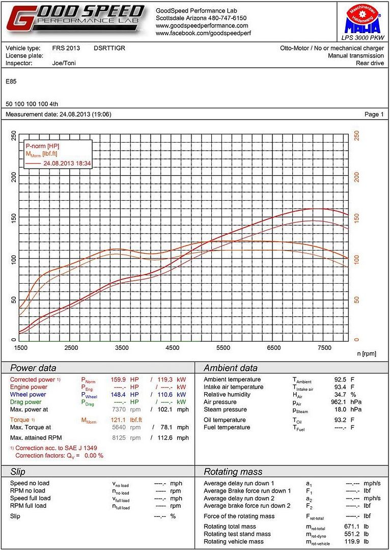 I'm still getting about the same average mpg, mostly because I don't have to rev as high to gain speed. E85 + Headers is the best NA upgrade so far. My car is much quicker than stock on E85. I think a stock auto FR-S only made 125whp on this dyno (for comparison).