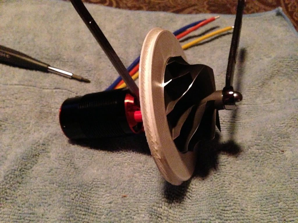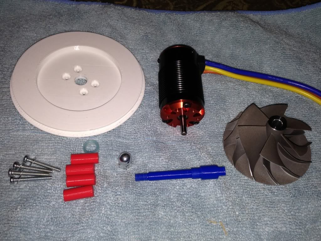 I got my motor today so I got busy in CAD on designing all the parts. Parts for test fitting are hot off the 3D printer (3D printing is awesome!). All the parts fit great so I'll be ordering all the off-the-shelf hardware bits & metal to machine tomorrow. The parts: -Backplate (3D Printed White) -Bearing (3D Printed Clear) -Shaft (3D Printed Blue) -Spacers (3D Printed Red) x4 -Screws & Washers x 4 -Compressor Wheel & Nut -12V Brushless Motor -Compressor Housing -O-Ring (Missing) ![]() The bearing is pressed into the backplate. An O-Ring would also be added in the notch but I don't have one yet. ![]() The shaft goes through the bearing ![]() The screws with washers are placed through the backplate and spacers are added to form the motor mount ![]() The motor is attached, and the compressor wheel is then placed on the shaft. A nut on the end of the shaft is tightened with one wrench while a second wrench is used to hold the shaft ![]() The assembly is then placed in the compressor housing and secured with a snap ring ![]()
