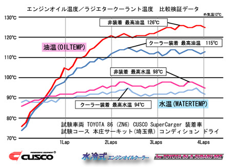 The graph shows it lowering the peak oil temp from 259 degrees to 239 degrees which whille not an immense amount may be the margin of safety needed. The tests seem to have been done with the Sprintex supercharger installed. Anyone read Japanese?