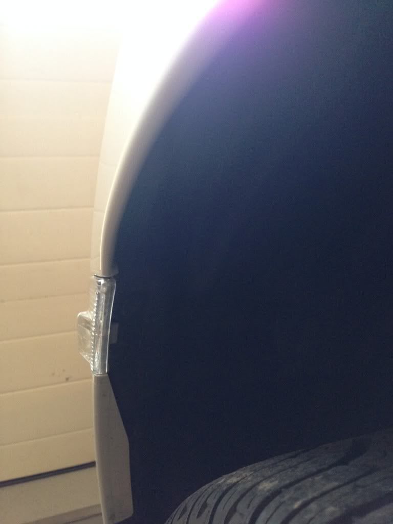 In preperation for new wider wheels up front that I'll mount this winter I rolled out the tabs on front fender by our marker lights. These have been known to gouge tires when going to 9-9.5" widths.