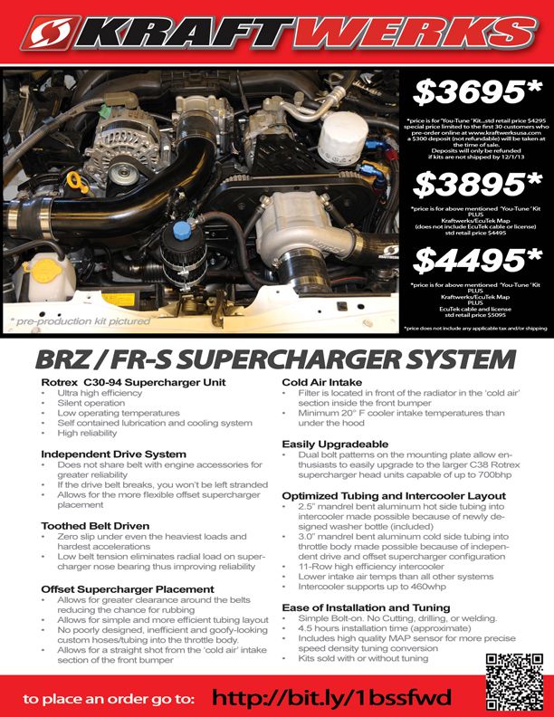Far as the flyer goes, I've gone through this thread post by post including the flyer that you were kind enough to post on a few threads. To clarify, I was referencing when the kit is released and to show the dyno WHP numbers, what size pulley, what kind of PSI output. I don't care about 650+ hp since I don't track. 250 to 300 WHP+ is more than enough. You can't really be responsibly driving more as a daily driver...part time track car sure more power is welcome...but for me reliability from 6 to 9 PSI with pump gas daily driver car. Looking forward to the release of KW's FI kit for this platform. |