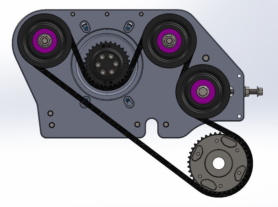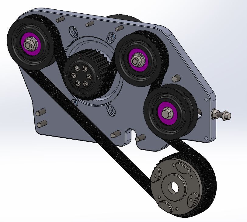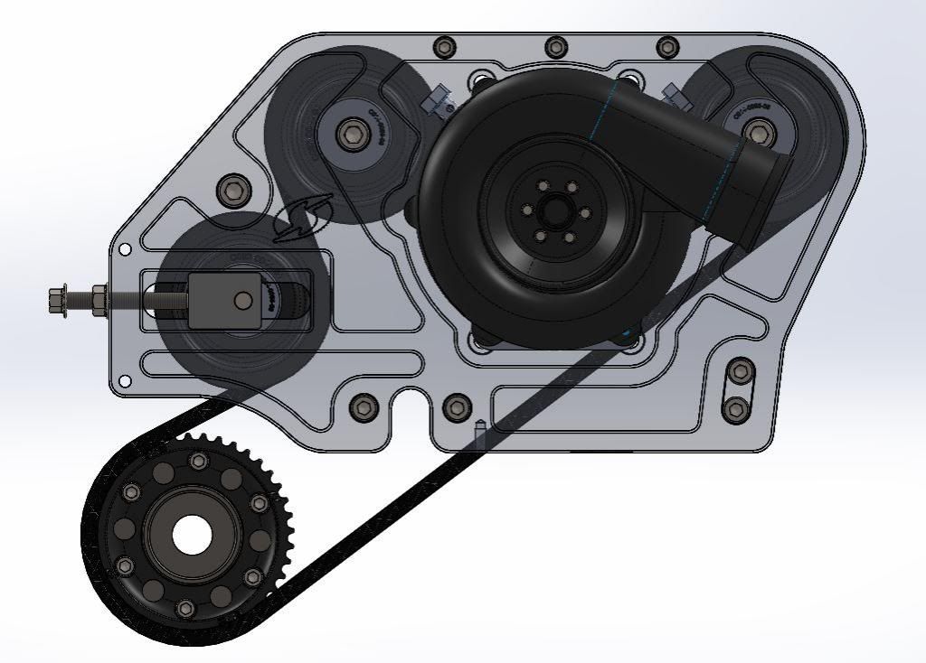 2) before critiquing the layout to heavily, please realize the cad model does not offer much insight as to the placement of the support brackets or parts protruding form the engine. also note....the reason for the double sided belt is because the supercharger is flipped around therefore we need to reverse the rotation by driving it using the outside of the belt...if rotrex had a counterclockwise offering, we could use a single sided belt and simplify the layout further....given these considerations, i think the layout is well thought out, simple, and elegant. 3) i do not understand your proposed layout, can you elaborate some more? a simple sketch for discussion purposes would be nice too |