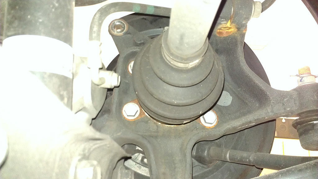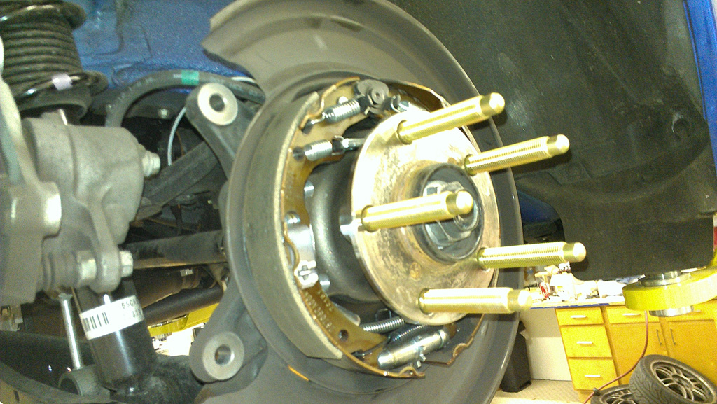 1. Lift the vehicle and safely support it (jack stands or a lift). 2. Remove the rear wheels 3. Remove the axle nut with an impact gun (or hand tools if no impact gun is available). You will need a 32mm socket for this job. Also if you are using hand tools you will need someone to stand on the brakes if the e-brake won't hold the axle from turning. 4. Ensure the the e-brake is released. 5. Remove rear brake caliper assemble (caliper, bracket and pads can all be removed together) and hang out of the way, as seen here: ![]() ![]() 6. Remove rotors (just pull on them). 7. Remove the speed sensor (10mm) on the top of the hub, the bolt is visible in this picture: ![]() 8. Remove the four bolts (14mm) bolts that hold the hub to the rear upright, three of the four are visible here: ![]() 9. Once all of them are removed you should be able to pull the hub assembly away from the car, push on the end of the axle to avoid the axle hanging up on the hub. 10. Once removed, use two of the bolts to secure the drum brake assembly to the car so that it doesn't hang: ![]() 11. Remove old lug studs using a press, or ball joint tool as shown above. 12. Install new studs using a press (if you have the right pieces, I couldn't use a press for the rears while I could for the fronts). 13. Reinstall is the opposite of the above. I used the same torque specs for the caliper bracket, hub bolts and speed sensor bolt that I used for the front. The axle nut is 136 ft/lbs. 14. Use a drift punch (or similar) to recrush the edge of the axle nut, or preferably, use a new axle nut and use the drift punch to crush the edge of the axle nut into the slot. Pic of it finished, save for the brakes being re-installed: