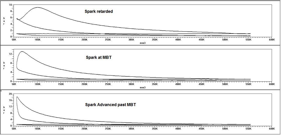 Peak cylinder pressures is highly sensitive to spark advance, or rather the phasing of peak combustion pressure. Allow me to illustrate. Here you can see a 300 engine cycle average pressure trace on this particular direct injected engine at an idle condition where knock is not really going to happen. This is all at constant torque, so other things were adjusted to make up for the effect of changing spark advance. The top pressure trace has peak pressure occurring around 40 degrees ATDC firing. Spark is very late, after TDC. Now look at the Y axis. Peak pressure is about 9 bar. Now look at the middle trace. Peak pressure is around 15-20 degrees ATDC, which at this speed and load is roughly MBT (minimum spark advance for best torque). Peak pressure is at 12.5 bar. Do the math--that's about 50% more cylinder pressure from retarded spark vs MBT, but engine output in the case is the same. Finally, check out the bottom trace. This spark is way past MBT, something like 30 degrees BTDC. Peak pressure is about 15 degrees BTDC, way too early. Peak pressure is now about 19 bar. From the two extremes of unnecessarily retarded combustion to overly advanced combustion we double the cylinder pressure. Let's look at it with a pressure-volume diagram, (x axis volume, y axis pressure) This relationship between non-knocking spark advance and peak cylinder pressure also exists at high loads. So what does that tell us? When we make our engine output relying on using knock resistant fuel and spark advance, it greatly increases cylinder pressure. What do you think that does to bearings? I'll say that again: Fully taking advantage of knock-resistant fueling with spark advance can be very stressful on the engine due to high cylinder pressures, and it's not knock causing the stress. This engine was never designed for high loads (lots of airflow crammed in there at a given rpm) and high cylinder pressures. Think about it when you put E85 in there, boost it, and have a low knocking tendency fueling (race fuel, E85, maybe water/meth). |