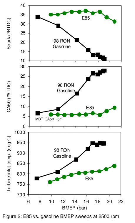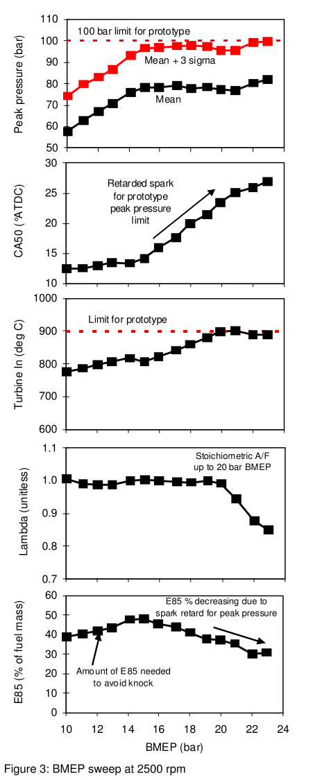 Here are some more relevant charts. For purposes of this discussion, BMEP can be converted to torque. 10 bar BMEP is 260 lb ft and 20 bar is 520 lb ft. CA50 is location of 50% burn. MBT is typically 6-10 degrees after top dead center. Add roughly 5 degrees for location of peak pressure (CA50 of 10 = peak pressure at roughly 15 degrees ATDC firing). Example: near 20 bar BMEP on this engine, so 520 lb/ft of torque at a fixed 2500rpm. With pump gas only, sprayed through port injectors, we run -10 BTDC degrees spark (10 degrees ATDC). With E85 direct injection we can run 30 degrees spark. The second chart is kind of complicated and hard to explain without reading the attached paper. Basically, they were dialing in spark, AFR, and E85 blend % to #1 not overheat the turbo and #2 not exceed 100bar peak pressure in order to protect parts in the engine. But you can see that they limited peak pressure to 100bar even when the engine wasn't knocking in order to prevent damage. They pulled timing even when they technically didn't have to, which then fed into the E85 blend ratio and Lambda so that the turbo didn't overheat. It's also a little complicated because you can go by average peak pressure across cylinders, average peak pressure over some number of cycles on a single cylinder, or peak pressure on a single cycle for a single cylinder. |
