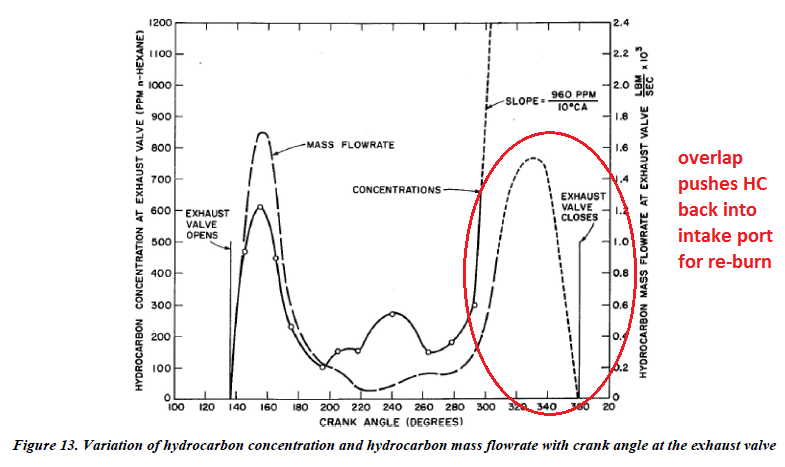 I haven't seen charts on the cam grind vs crank angle, but the valve overlap burns up the HC emissions if intake valve ends up opening BTDC intake. It's commonly used on Japanese cars. What happens is, the HC emissions are ejected mostly when the exhaust valve opens and when it closes. If the intake valve is open at the end of the exhaust event with piston still ascending, that HC goes back into the intake port where it can be burned up on the next cycle. One last thing to keep in mind. The stock tune was designed to start and idle ok on really crappy fuel (does not vaporize well) in very cold climates. That's one of the reasons why it behaves the way it does. There are special lab-grade "heavy startability fuels" that's used to test this. So there is a certain safety margin you are seeing in the stock tune. One of the side effects to that can be NVH concerns. |