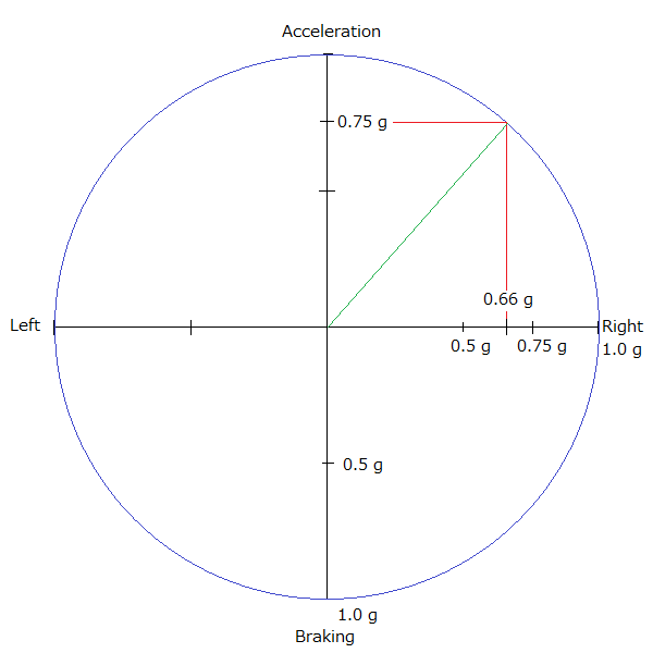 ![]() You are right that yes, you are producing 1 g all over the circle. The difference is how you produce that 1 g. As my examples above demonstrate, you get more use of your tires, and thus better lap times, by combining forces on the tires. If you datalog with an accelerometer (you absolutely can measure individual forces) and a good driver you will notice they can follow the perimeter of the circle quite closely. Here is a real example from Dennis Grant (http://farnorthracing.com/): ![]() Quote: