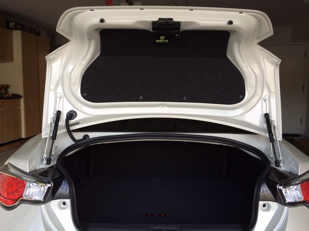 I installed a BRZ trunk lid liner to complete the look of the trunk and to also reduce the noise a bit when I drive with the back seat down. Installation is a breeze!