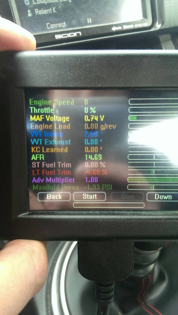 Hey guys. If you are watching manifold pressure on the oft you have to add the atmospheric pressure to get your true boost. With my car off the oft reads -1.93 boost so I have to add 1.93 to get the actual boost being created Attachment 74169