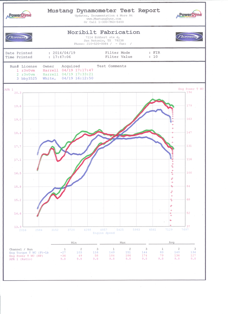 Red - My car which has the AFE Takeda intake, Nameless headers, Nameless Over/Front catted and resonated pipe, with the stock catback tuned on 93 octane.