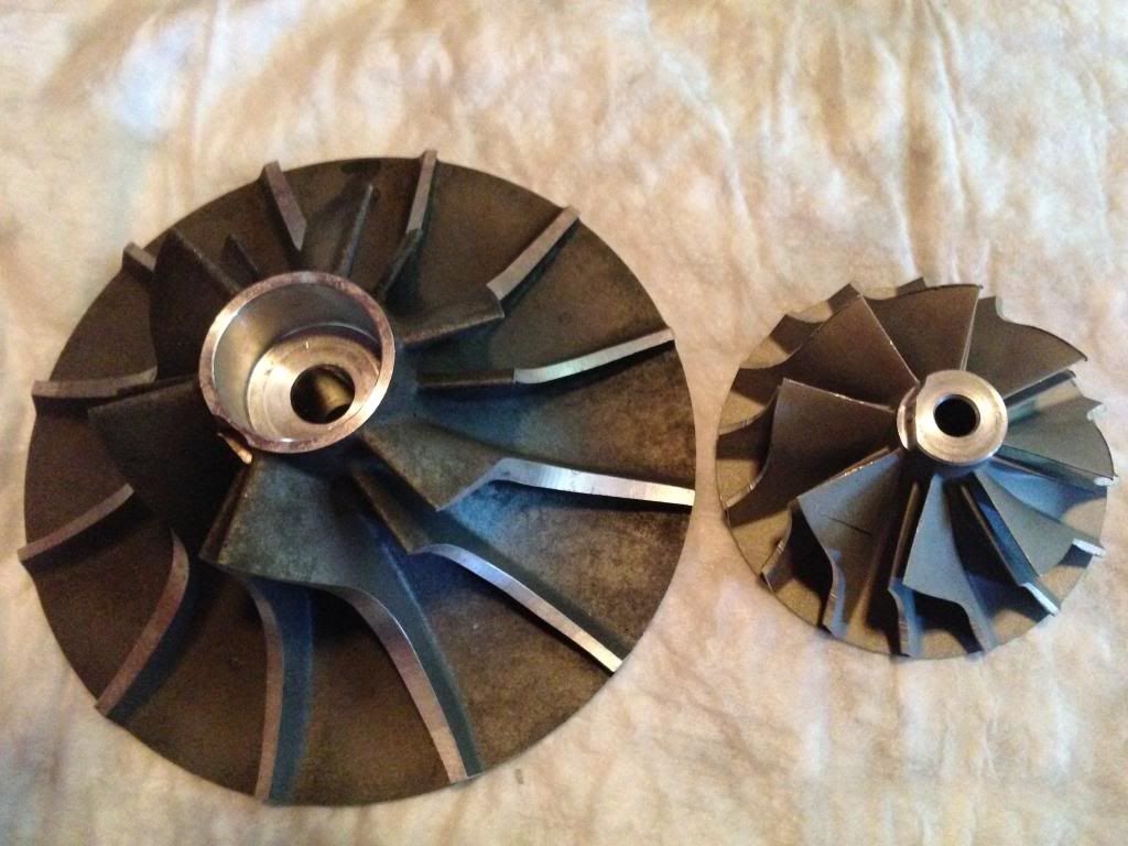 So I got my SeaDoo supercharger compressor today. Here it is next to a T3/t4 compressor wheel to give you an idea what a major difference in size there is. I'm hoping this will be a good fit for a larger motor with lower max RPMs.