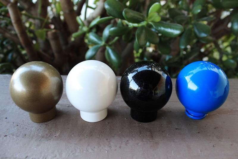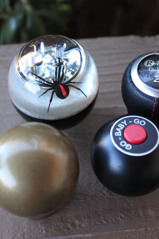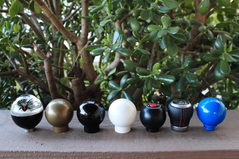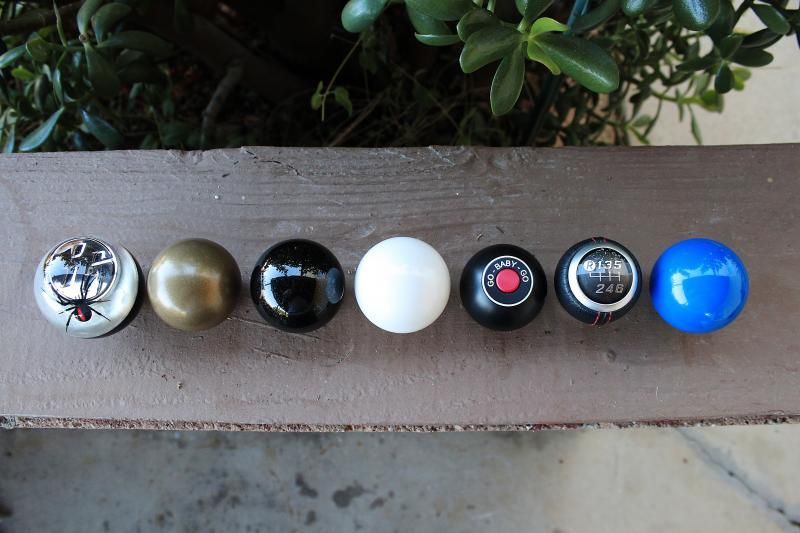 Here are my current shift knobs (in order from left to right: Custom Redback custom knob with 86 badge embedded, California Gold Anarchy Motive, Galaxy Black Anarchy Motive, Pearl White Anarchy Motive, WC Lathe Werks custom engraved black copolymer sphere, Stock Scion knob, Tiger Blue Anarchy Motive 5 speed knob [for 1997 Miata])