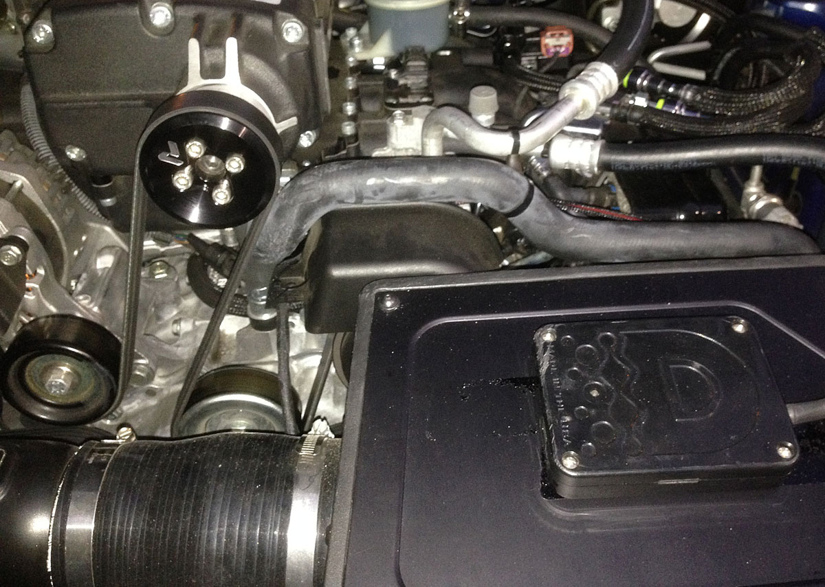 Just to show we are testing the hiccup under cruising conditions at 5000 RPM's with the 70mm pulley, here is a picture. We just finished our tank of E85 today and filling up with 91 octane tomorrow morning. Pay no attention to the other gizmos in the picture.