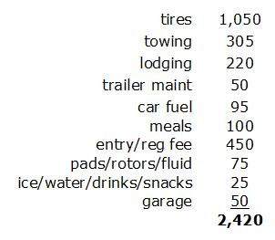This is a quickie back of the envelope estimate for a two-day event that's 250 miles away, and to which I tow a race car in an enclosed trailer: ![]() I pay $1250 for mounted tires, use them for eight heat cycles, and then sell them for $200. I don't drive a lot of laps, so I'm probably on the track for maybe 45 minutes a day. If it's going to be wet and I'm out of wet tires, then I have to get a set of them, too. Usually, I can pick up new or used wets for short money - last set was $590 delivered and mounted. Mine always age out before they wear out. Not included are the expenses to maintain the car (except for brakes), nor the cost to maintain the truck. I use a shop so car maintenance expenses are high - just the post-event nut & bolt runs around $300. When drivers ask me what it costs to run a towed race/track car, I always suggest that if they're not prepared to spend $1,000/day they might want to rethink it, or maybe plan on doing everything themselves and maybe also running rubber until it can't be run anymore. Some cars will tolerate the latter better than will others. |