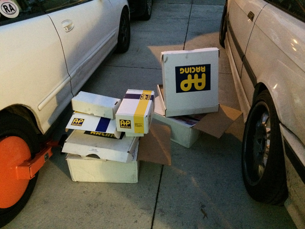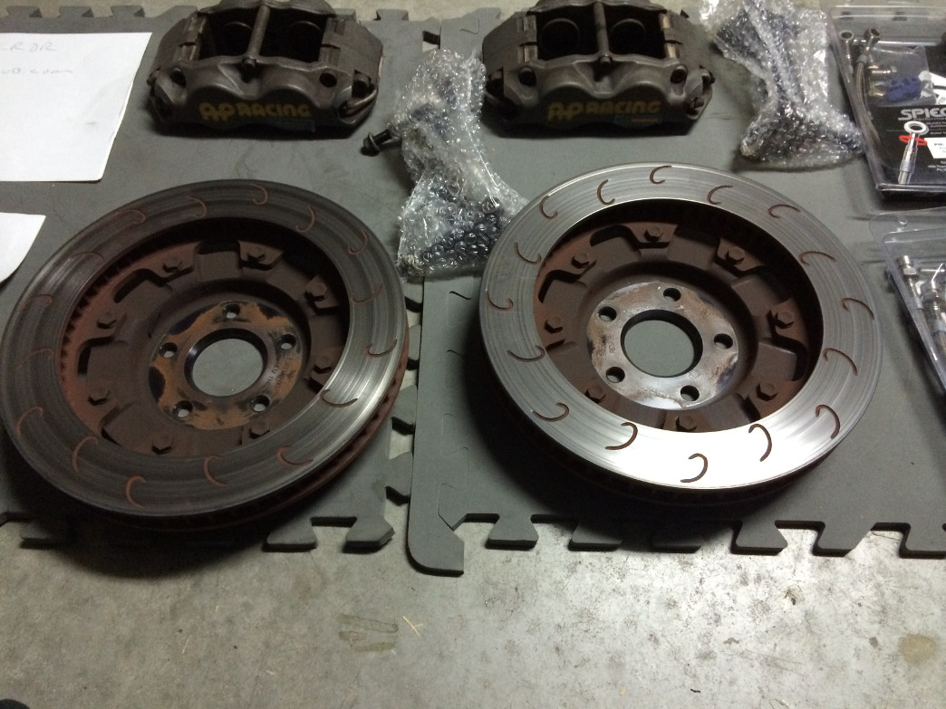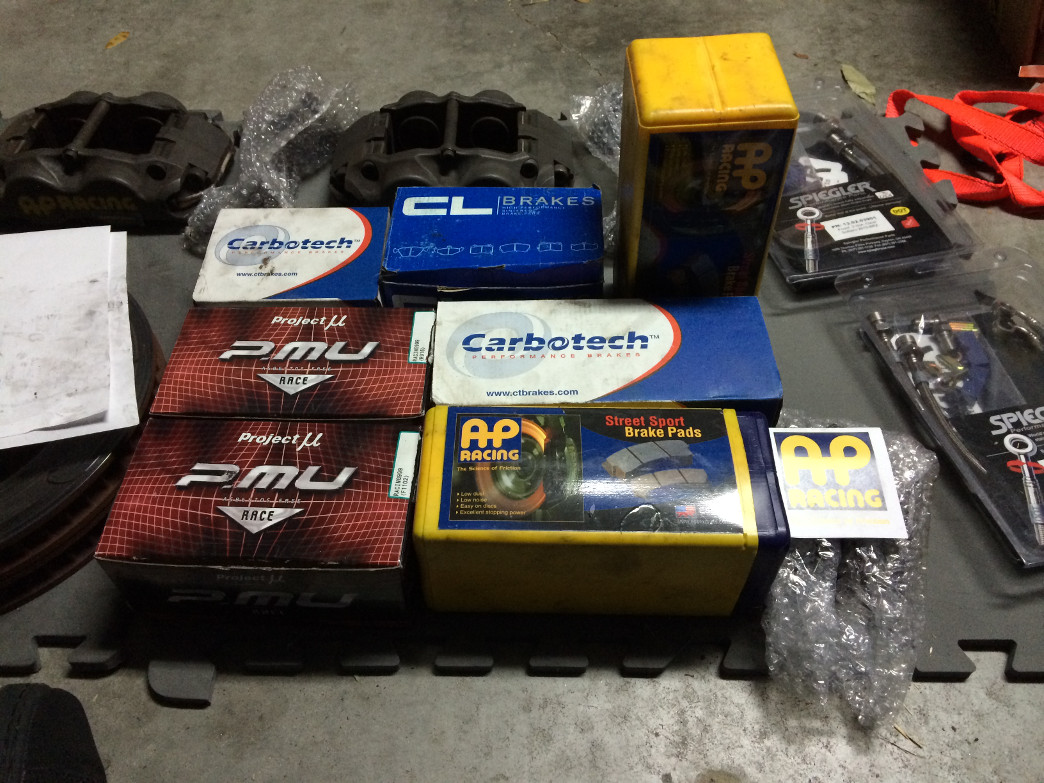 Item: Man, this thread is a painful one to write as I will miss these brakes Since I'm selling the car it's pointless to keep them though. I am not opposed to keeping some of the pads as I can reuse them on my MR2 and M3 eventually as I plan to have CP8350s on both but if they sell.. well they sell. Anyways this thread is for my Essex Sprint Kit (includes brand new Spiegler front and rear SS lines), extra set of brand new burnished rotors, AP C300 front and rear pads, AP S100 front and rear pads, Project Mu 999 Racing front and rear pads, CL RC6E front pads, Carbotech XP8 rear pads. Discount of 20% for whichever front pads the buyer of the BBK wants. Some pads and new, most are used. One issue is that I'm not 100% sure which of the brand new AP rear pads are S100 and which are C300. I think I know based on what appears to be higher metal content in one of the sets, but both will be priced as if they were the cheaper S100s just in case. Perhaps @JRitt can confirm. Also will put new temp stickers on the calipers before shipping them out assuming I still have some (I should..)