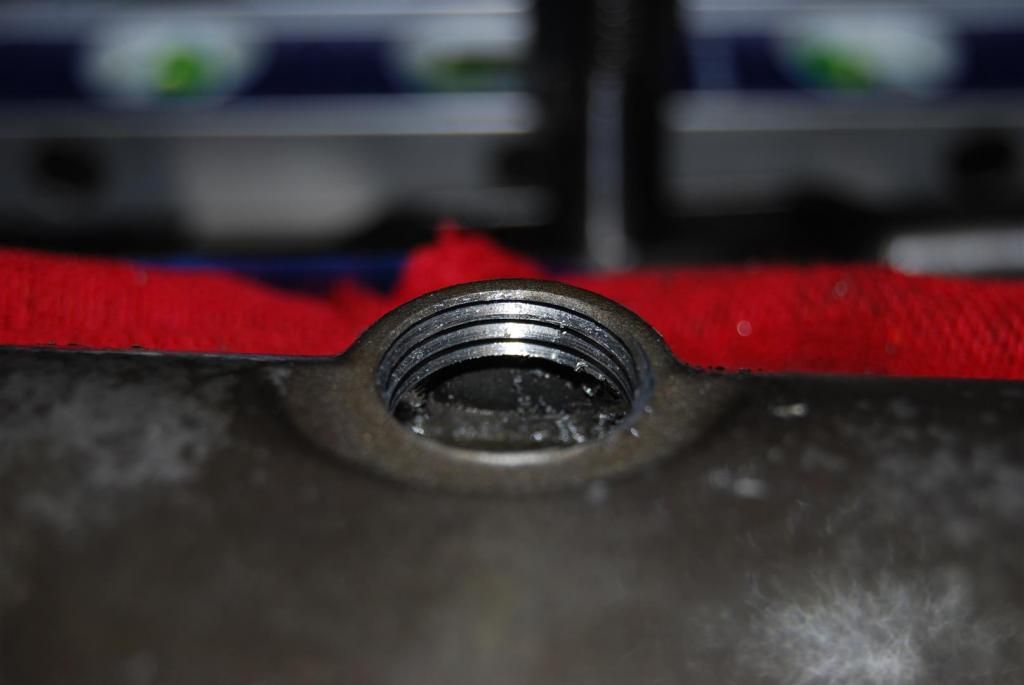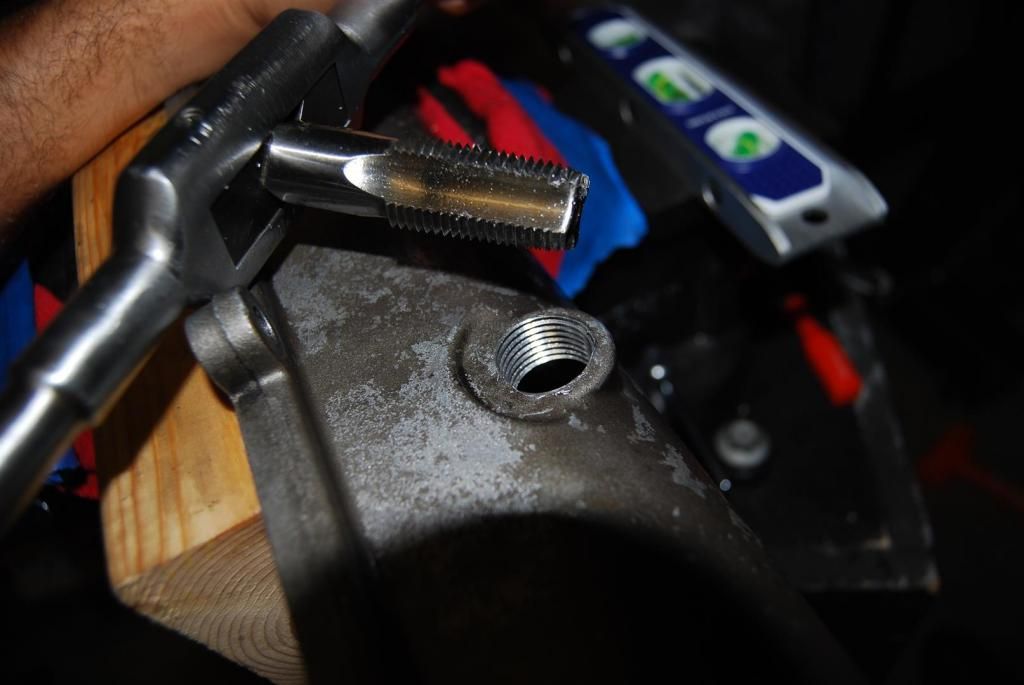 Tap in progress. When I was tapping, I would rotate a full turn, then back off about a 1/4 turn to break off accumulated shavings during the threading process.