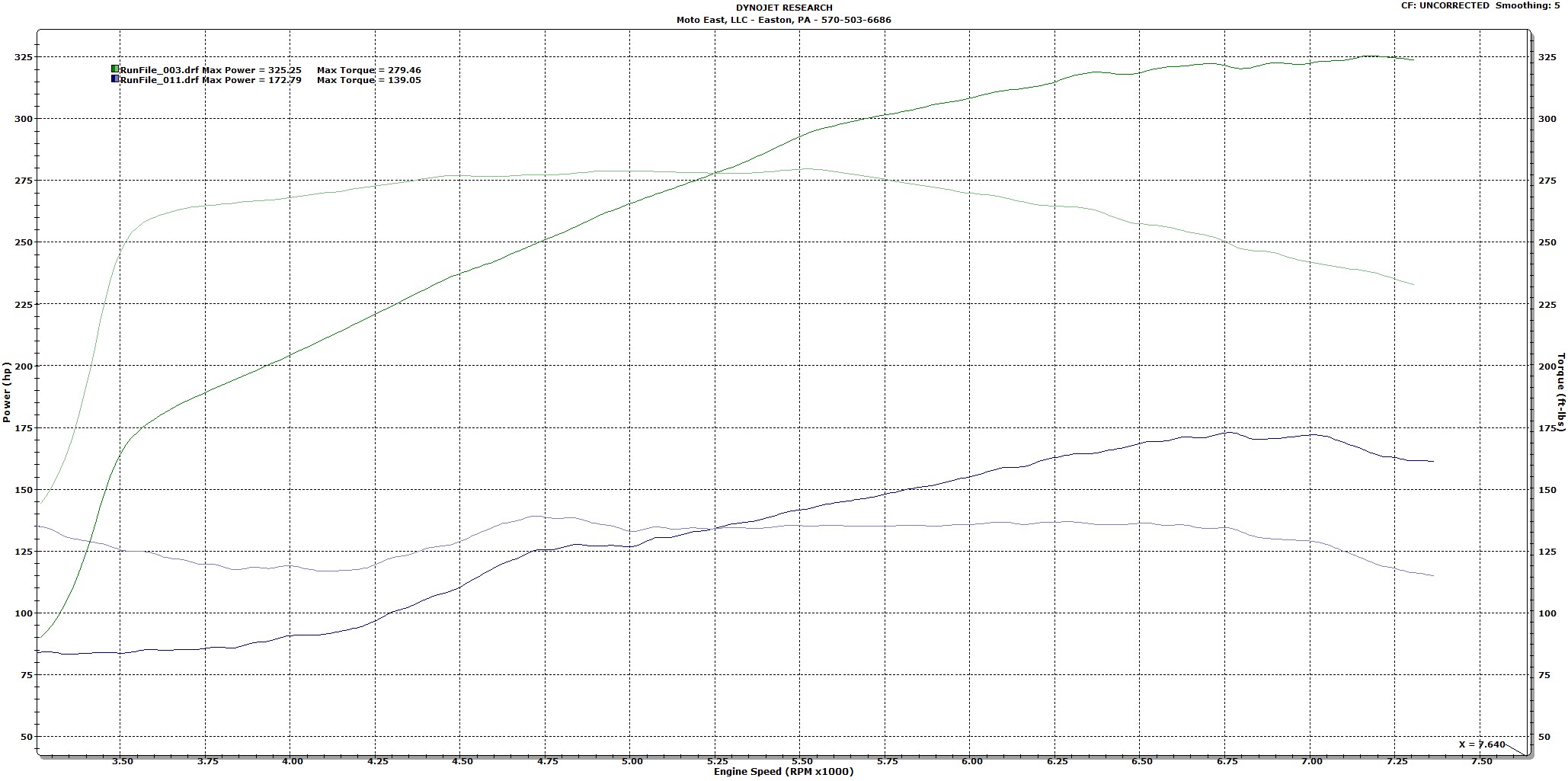 Strapped down and ready for action: ![]() This is our initial baseline taking the 210 tune, and taking out some timing (a good amount...) ![]() You can see that the power is super smooth and comes on EARLY. This is a torque curve of a strong OEM v8. Did I mention this is on the "low timing" map? Difference is about a couple degrees. Next step is to give it a bit more timing. ![]() Picked up a bunch of mid range with just a small change. This is showing some potential. However, in light of the relatively "low" numbers (I'm brave until about 300 tq on the stock motor) we rolled back some of the cam timing changes so that it can generate close to full boost. This is the result of the subsequent run. Unfortunately the bypass stuck for a second or two, so all the subsequent runs will be best compared at 3500+. ![]() Now we're having some fun. You can see the gobs of torque we picked up, and this was a relatively minor change. We're still not at the cam timings we used on the 210. Speaking of the 210, how does that compare on a dyno that reads about 5% higher than this one? ![]() You can see the 335 absolutely destroys it. The 210 plot is on e85, full bolt ons, 70mm pulley, etc...the 335 run is on an 80mm pulley and a mostly stock car with a stock header and cat back on e70. We did change out the front pipe/overpipe since we had the trans off to get the clutch, but those won't do a damn thing with a stock header and cat back. So there is still a whole lot left on the table. Our experience is that the 70mm pulley should generate about 15% more HP for a given boost level, and the stock header and cat back are surely a major restriction here. But since our goal was to see if a mostly stock car can handle it, this is exactly why we put it back to stock and wanted to test this way. Now a few more comparisons. This is a 335 vs a turbo kit. Goes to show you that not all HP is created equal, and here particularly despite the equal HP, only one smokes the tires a gear early ![]() ![]() And of course, for those NA, this should really make you want to upgrade! ![]() We'll get some video up, but once this tank runs out we'll be going to pump gas. I'm very confident we'll be just fine on pump gas. Our method of "blowing off" extra boost is working just fine, and 280 torque on e70 will be an easy 250 torque on pump gas. So I can entirely see this system working for folks who run that exclusively. Then if you ever build the motor or get e85/race gas, you'll have an extra 50-100 hp at your disposal depending on pulley size, or with a built motor. The standard Raceseng 70/72.5 pulleys will fit this application just fine, and we will probably head that route in 2015 once we get a few other projects here cleared out so we can build the motor. |