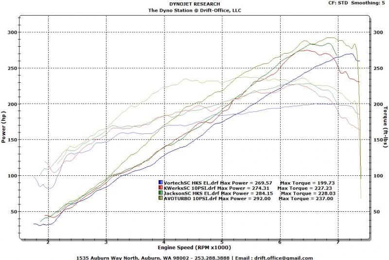 That chart you posted shows aftermarket headers being used with the SC kits (hence, most likely not on the Carb tune neither). So, of course it will have more whp. As far as my numbers (besides the aforesaid 153whp baseline Mustang with a 206whp result from a jrsc carb tune).. I'm personally basing it from a few other dynos I've seen, with jrsc carb tune running 245whp on dynojet (with around a 180whp base iirc)..around 270hp flywheel if I'm not mistaken. Correct me if I'm wrong. |