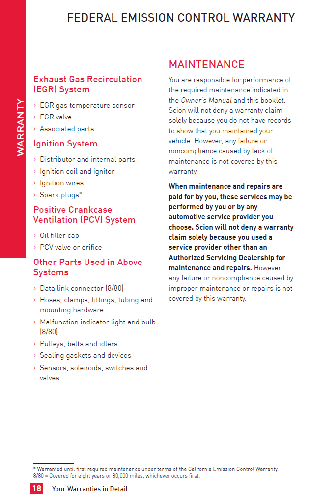 Per the "Warranty and Maintenance Booklet" in every single car's glovebox (this is the Scion version 2013) shown below. Note that this is a legally binding document detailing the warranty and is easily accessible to every single owner, no need consult a lawyer.