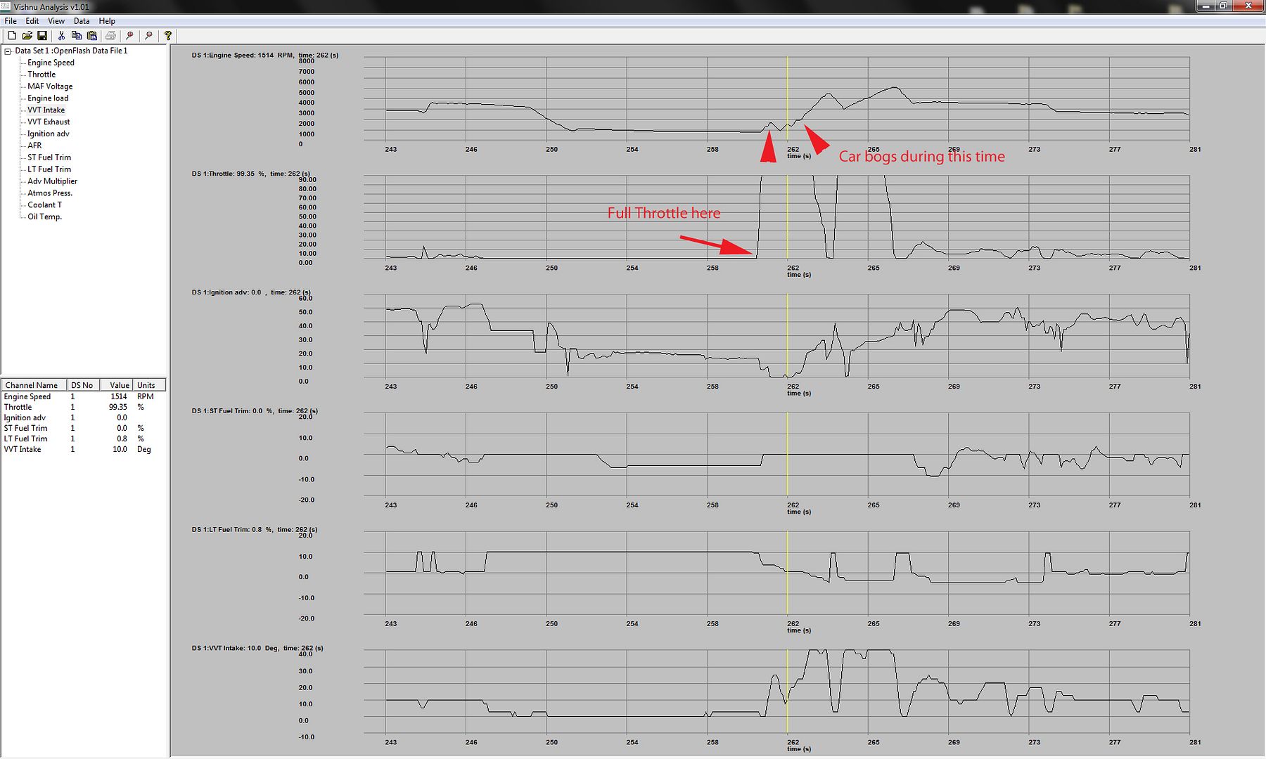 Here is a photo: ![]() I'm not sure I included the right info with the log, but you can see with full throttle that the RPM's actually drop instead of accelerate and the car just doesn't do anything. |