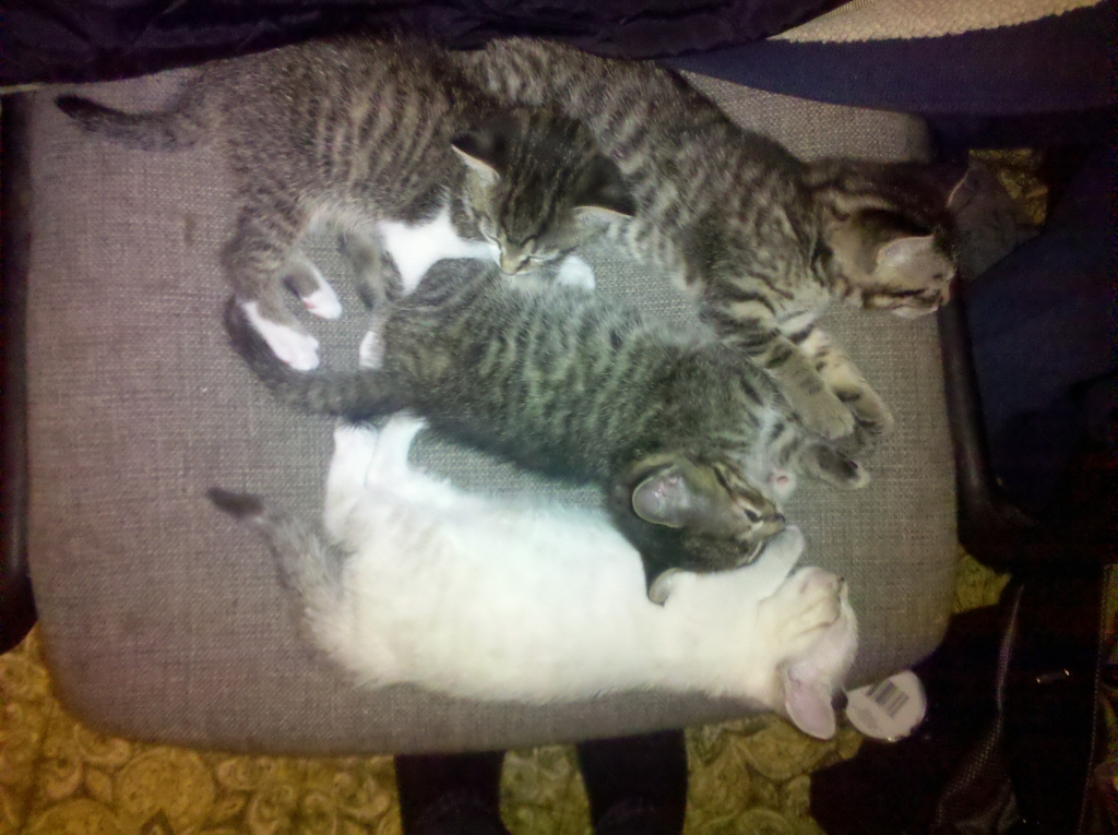 The wildcat had kittens() and they were evicted out of the bathroom now that they are bigger. For some reason I keep finding them in my office chair and around my computer.
