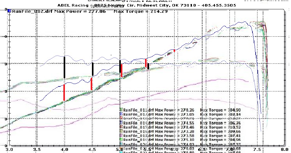 Here is a terrible comparison of the dynos, I threw together between the OFT 300 dyno and shiv's SBD dyno. Both are on the OFT maps (vortech 9 psi, SBD 10 psi) Obviously there are a ton of potential issues when comparing these but I thought it might be interesting either way. The black lines are the differences between torque and the red are gap between horsepower. HP values on the left start at 50 and go up to 300 in increments of 50.