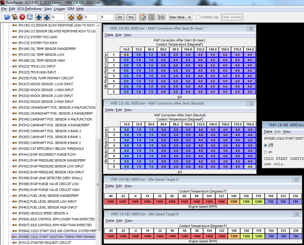My ignition timing post start is set to -8.05 through the entire row, MAF Correction After Start is set to 8, 7, 5, 5, 5, 4, 4, 4, 4 on all rows for both in gear and neutral, and for good measure, I disabled the DTC for P050B - not sure if I needed to do that one.