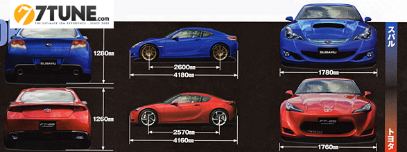 Body wise, the the Subaru version will be bigger and badder but at the same time tipping the scales to the tune of around 100kg more than the 086A. This seems to be a reasonable weight gain seeing that 4WD has been added and the dimensions have been increased in the region of 20mm all around. Total height and width will go from 1260mm to 1280mm and 1760 to 1780mm respectively. Wheelbase and total lengths have also been extended, with overall length reaching 4180mm and the wheelbase gaining 30 to 50mm, up to around 2600~mm from 2570mm. This is almost spot on to the current Impreza’s 2620mm so the possibility of them sharing parts or being very similar is undoubtedly high. The final distinguishing factor between the two? Well that will be the price. The increased performance, all wheel drive and pumped body will be adding around half a million yen to the tag bringing the car to around 3 million yen come 2011. This is not only to cover the extras over the Toyota but also to distinguish itself from the FT-86 version. -- Source: http://www.7tune.com/confirm...r-subaru-216a/
