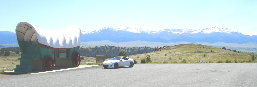 Ridiculously huge conestoga wagon / viewpoint / information kiosk on the south end of Oregon Hwy 7 in the upper drainage basin of the John Day river.