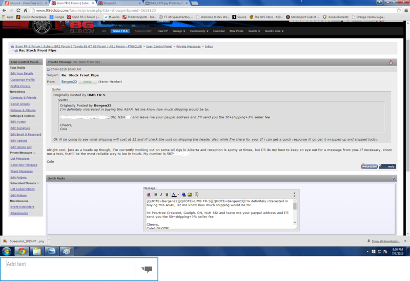 ![]() tracking number was to be sent after payment was received tracking # 0316725001000641 shipped with canada post on sat @ 11:57 picture of front pipe before packaging in 30 ft of thick bubble wrap ![]() seems your doing allot to discredit me but in the end I have nothing to hid. I fulfilled my end of the bargain you chose to not reply to texts after a price was agreed and at no point after I requested a payment via e transfer did you say you would prefer paypal.