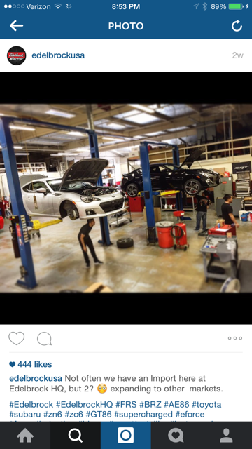 Here is my FRS AT with the Edelbrock SC. I was the one that volunteered my car to them for testing. Could't pass up the opportunity when it arose. I was originally 3rd in line but the other 2 dropped out for various reasons as you may read on the forums. Anyways Edelbrock has had it for over about a month now testing it and hopefully I will be getting it back soon with the CARB sticker also. They told me my warrant starts when i get it back. They wanted me to bring my car to Auto Enthusiast day but I was out of state this past weekend and their policy is that only the owner could bring it to the show. Anyways here are some pics. One was emailed to me (don't know why the orientation is not right side up as when i uploaded it was fine) , the other I just got off of IG. Their's of course is the BRZ which they have wrapped and mine is the FRS in the back.