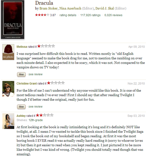 ![]() I liked DRACULA just fine. I think it all depends on your attention span, and what you'd RATHER be doing. I've read THE LORD OF THE RINGS at least four times, beginning when I was in 5th grade, before I had television and a gaming console. I tried to read it last year and discovered that my poor attention span just isn't what it used to be.